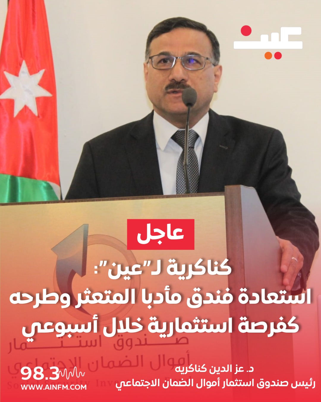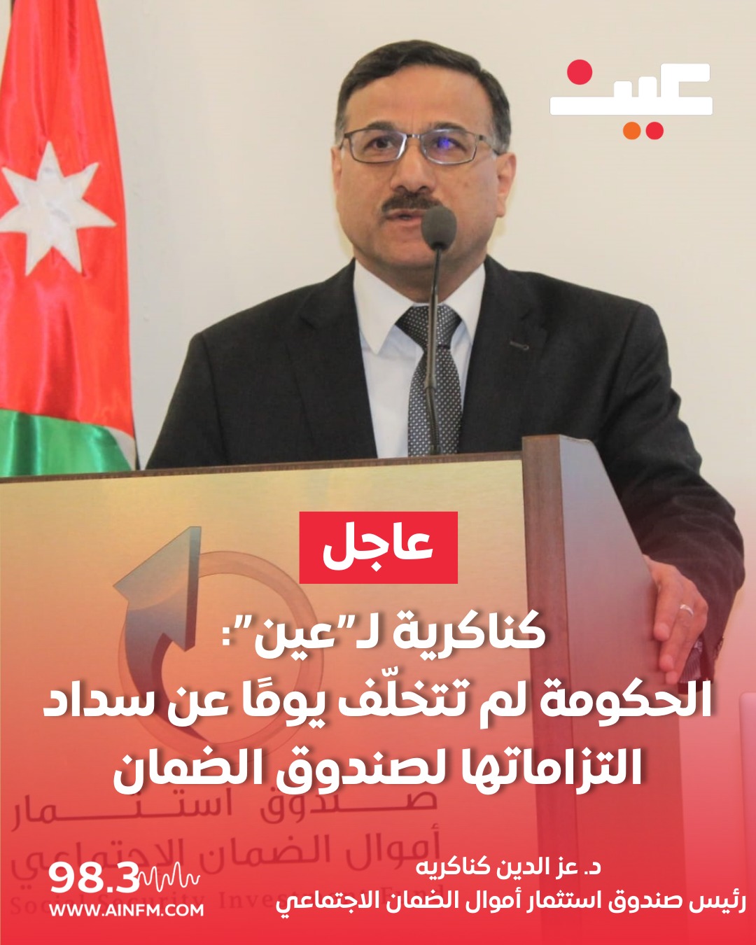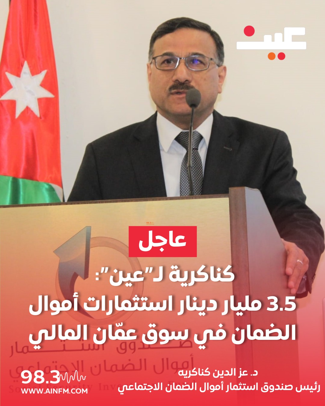 كناكريه لـ"عين": تحقيق دخل شامل استثنائي لصندوق استثمار الضمان في 2025 بقيمة 2.2 مليار دينار كناكريه: 3.5 مليار دينار استثمارات صندوق أموال الضمان في سوق عمّان المالي كناكريه لـ"عين": نستثمر في 13 بنكًا وشركات التعدين والاتصالات والكهرباء كناكريه لـ"عين": الحكومة لم تتخلّف يوما عن سداد التزاماتها تجاه صندوق الضمان كناكريه: استعادة فندق مأدبا المتعثر وإعادة طرحه كفرصة استثمارية خلال أسبوعين
