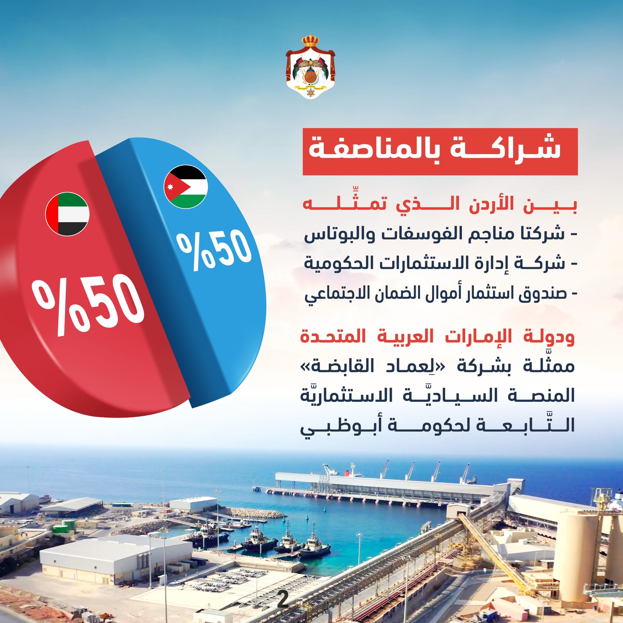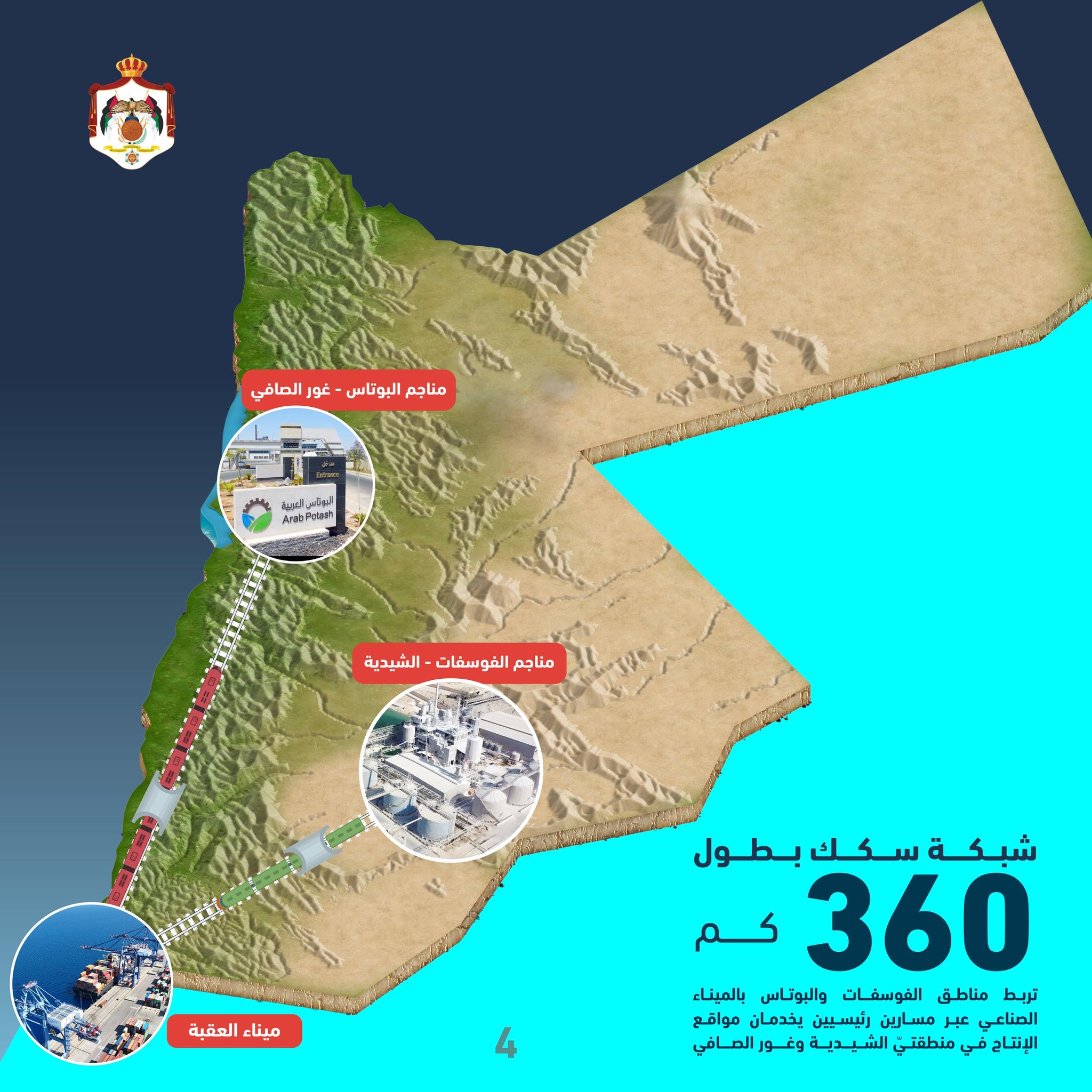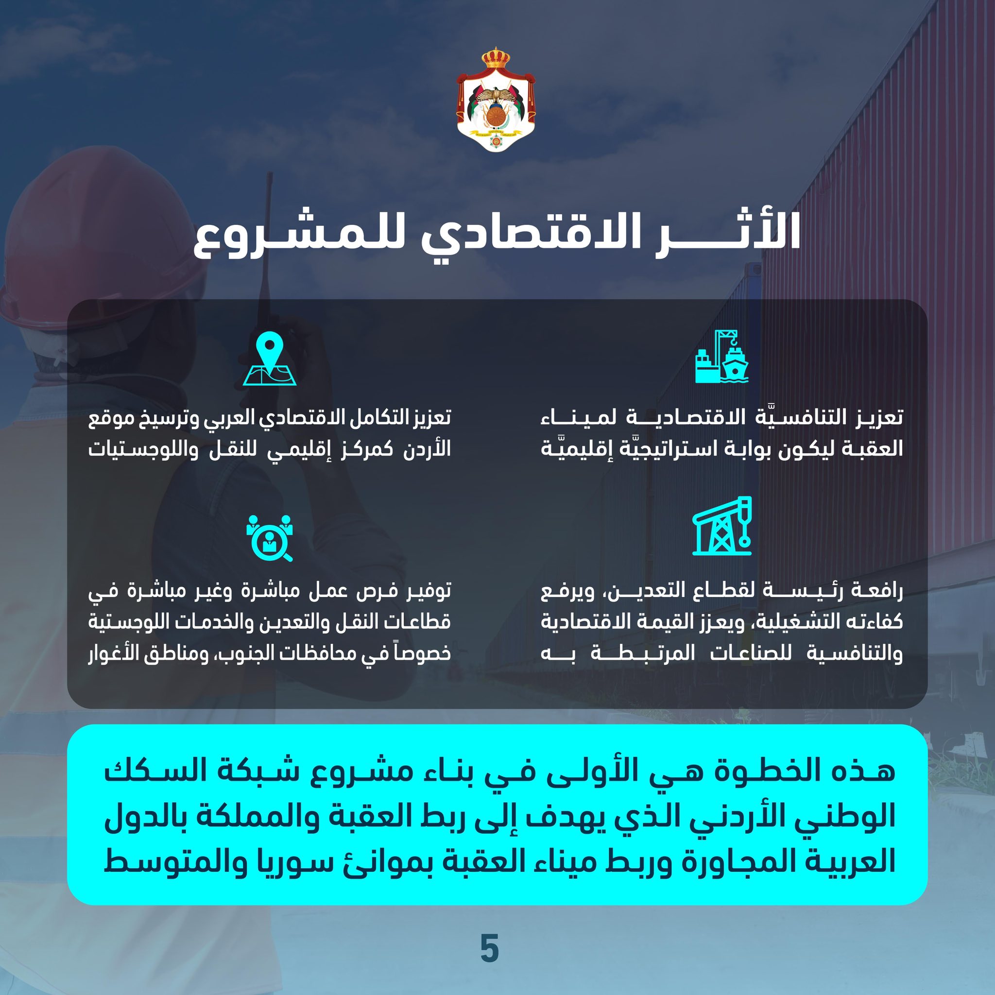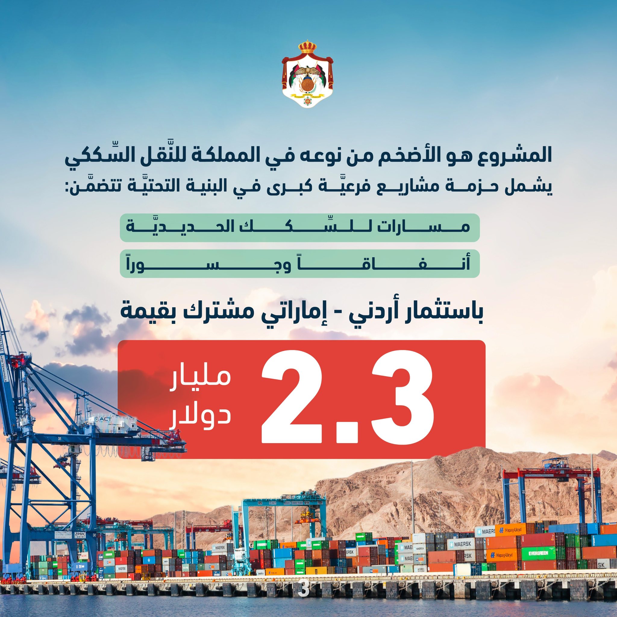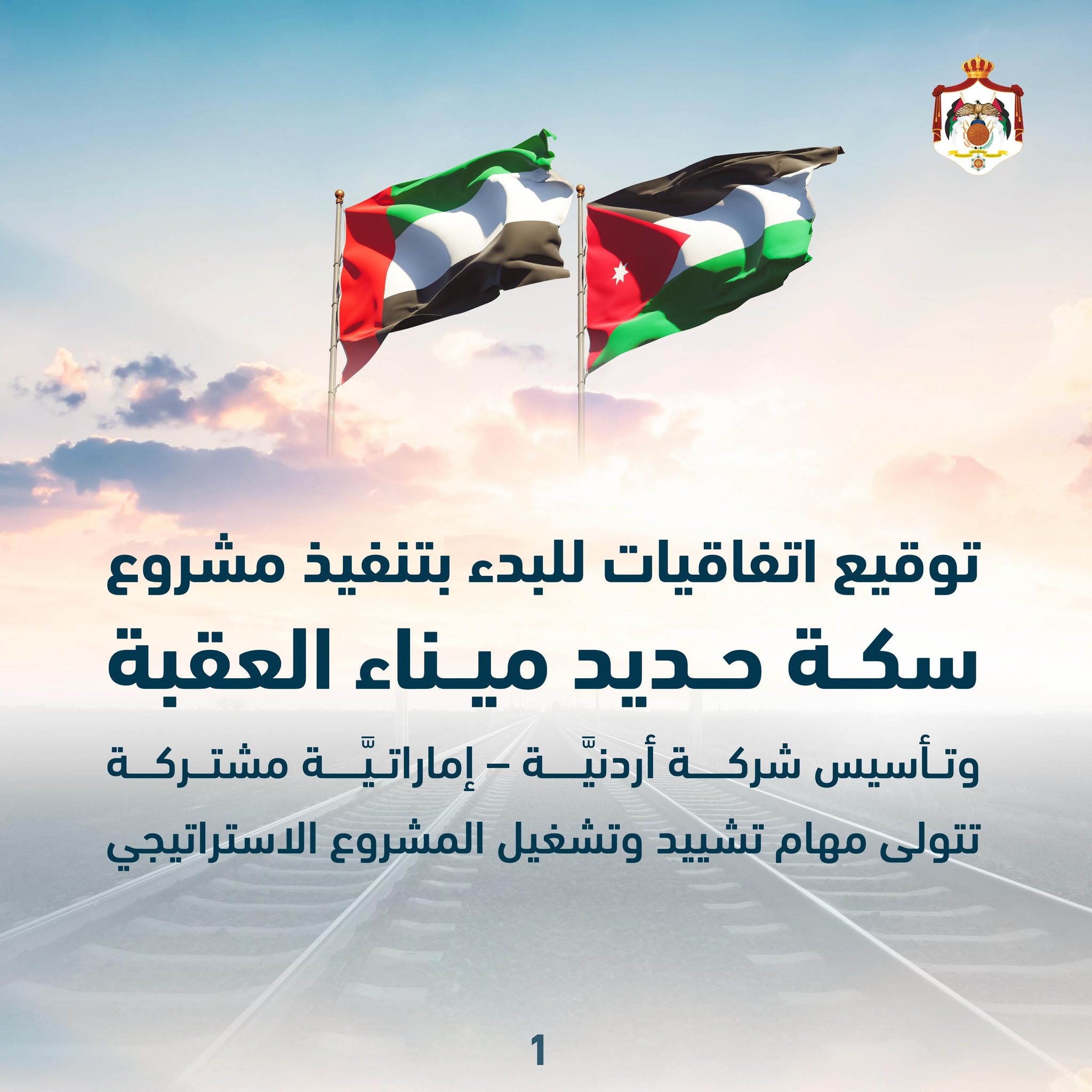 شهد رئيس الوزراء الدكتور جعفر حسَّان وسموّ الشَّيخ منصور بن زايد آل نهيَّان نائب رئيس دولة الإمارات العربيَّة المتَّحدة الشَّقيقة نائب رئيس مجلس الوزراء ورئيس ديوان الرِّئاسة توقيع الاتفاقيَّات لبدء الإجراءات الفعليَّة لتنفيذ مشروع سكَّة حديد ميناء العقبة، وتأسيس شركة أردنيَّة – إماراتيَّة مشتركة تقوم بمهام تشييد وتشغيل مشروع سكَّة حديد ميناء العقبة. ويقوم مشروع سكة حديد ميناء العقبة على شراكة بالمناصفة بين الأردن الذي تمثِّله شركتا الفوسفات والبوتاس وشركة المساهمات الحكوميَّة وصندوق استثمار أموال الضَّمان الاجتماعي، ودولة الإمارات العربيَّة الشَّقيقة ممثَّلة بشركة "لِعماد القابضة" المنصة السياديَّة الاستثماريَّة التَّابعة لحكومة أبو ظبي. والمشروع هو الأضخم من نوعه في المملكة للنَّقل السِّككي، باستثمار أردني - إماراتي مشترك بقيمة تقدَّر بقرابة 2.3 مليار دولار، ويشمل حزمة مشاريع فرعيَّة كبرى في البنية التحتيَّة تتضمَّن مسارات للسِّكك الحديديَّة، وأنفاقاً وجسوراً، وفق المواصفات العالميَّة المُثلى في قطاع السِّكك الحديديَّة. ومن شأنه تعزيز التنافسيَّة الاقتصادية لميناء العقبة ليكون بوابة استراتيجيَّة إقليميَّة في النَّقل والشّحن والخدمات اللوجستيَّة، مثلما يفتح مجالات تنمويَّة واسعة في المملكة، خصوصاً في محافظات الجنوب ومناطق الأغوار. وتعد هذه الخطوة هي الأولى في بناء مشروع شبكة السكك الوطني الأردني الذي يهدف إلى ربط العقبة والمملكة بالدول العربية المجاورة، وربط ميناء العقبة بموانئ سوريا والمتوسط. ويأتي المشروع امتداداً للاتفاقيَّة الاستثماريَّة المشتركة البالغة قيمتها 5.5 مليار دولار، التي وقَّعها الجانبان نهاية عام 2023 بحضور جلالة الملك عبدالله الثاني وسمو الشيخ محمد بن زاید آل نهیان، رئيس دولة الإمارات. وسيسهم المشروع في تحريك قطاعات اقتصاديَّة مهمَّة، وإحداث تحوُّل جذري في قطاع النَّقل والخدمات اللوجستيَّة، من خلال ربط مباشر بين مواقع التَّعدين والموانئ، وتقليل كلف النقل، وتحسين كفاءة سلاسل التوريد والتصدير، ومضاعفة صادرات البوتاس والفوسفات. ويشكل المشروع رافعة رئيسة لقطاع التعدين، ويرفع كفاءته التشغيلية، ويعزز القيمة الاقتصادية والتنافسية للصناعات المرتبطة به. ويعتبر المشروع نواة للتوسُّع باتجاه منطقة الماضونة، ومنها شمالاً إلى سوريا لربط ميناء العقبة بموانئ البحر الأبيض المتوسِّط عبر سوريا وتركيا ومنها إلى أوروبا، إلى جانب تعزيز ربطها بالمملكة العربيَّة السعوديَّة الشَّقيقة ودول الخليج العربي، وبما يسهم في تعزيز التكامل الاقتصادي العربي وترسيخ موقع الأردن كمركز إقليمي للنقل واللوجستيَّات. ويتضمن المشروع إنشاء شبكة سكك حديديَّة بطول 360 كيلو متراً تربط مناجم الفوسفات والبوتاس بالميناء الصناعي، عبر مسارين رئيسيين يخدمان مواقع الإنتاج في منطقتيّ الشيدية وغور الصافي. وسيتم نقل قرابة 16 مليون طن سنوياً من الفوسفات والبوتاس عبر شبكة السكك الحديدية، بواقع نحو 13 مليون طن فوسفات و2.6 مليون طن بوتاس، ما يعزز القدرات التصديريَّة، ويرفع تنافسية قطاع التعدين في الأردن. وبدأت الحكومة دراسات لربط المسار الواصل إلى مناطق التَّعدين في الشيديَّة بوصلة تمتد إلى منطقة معان التنموية، بشكل يتكامل مع دراسات إنشاء ميناء معان -العقبة البرِّي كنواة لمنطقة لوجستيَّة وجمركيَّة وصناعية جديدة. ويتوقَّع استكمال الغلق المالي للمشروع بداية عام 2027 ليبدأ التَّنفيذ على مدى 5 سنوات وفق مسار تنفيذي واضح. ويوفّر المشروع فرص عمل مباشرة وغير مباشرة في قطاعات النقل والتعدين والخدمات اللوجستية، ويفتح آفاقاً تنموية واسعة. وستخصِّص الحكومة المبالغ اللازمة لتعويض أصحاب الأراضي التي سيتمّ استملاكها في مناطق الأغوار لغايات تنفيذ هذا المشروع، أو توفير أراضٍ بديلة لهم بشكل عادل. ويُنفَّذ المشروع بشراكة مع شركة "لِعماد القابضة"، والتي ستقوم بنقل خب